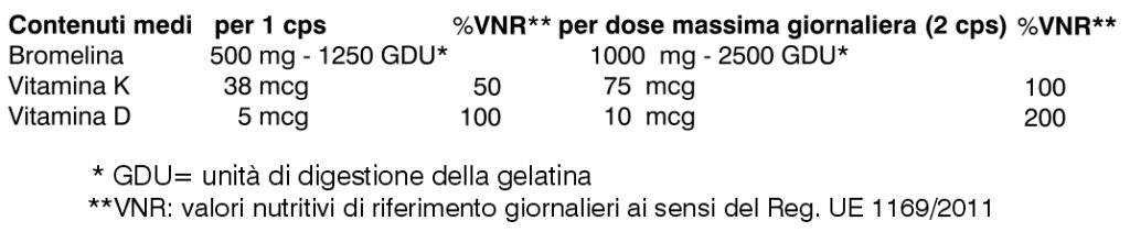 Calcio fosfato tribasico, Bromelina, Gelatina alimentare, Vitamina K2 (Menachinone-7, maltodestrine, acidi grassi).